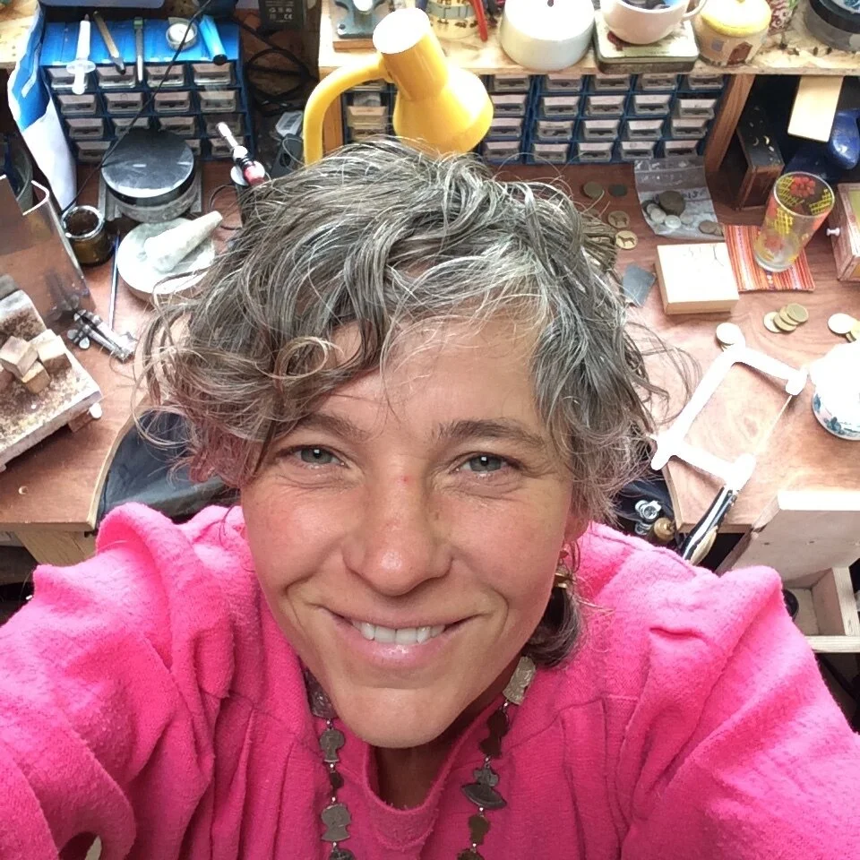 Rachel meticulously hand cuts designs from obsolete coins from around the world and sets them in silver.